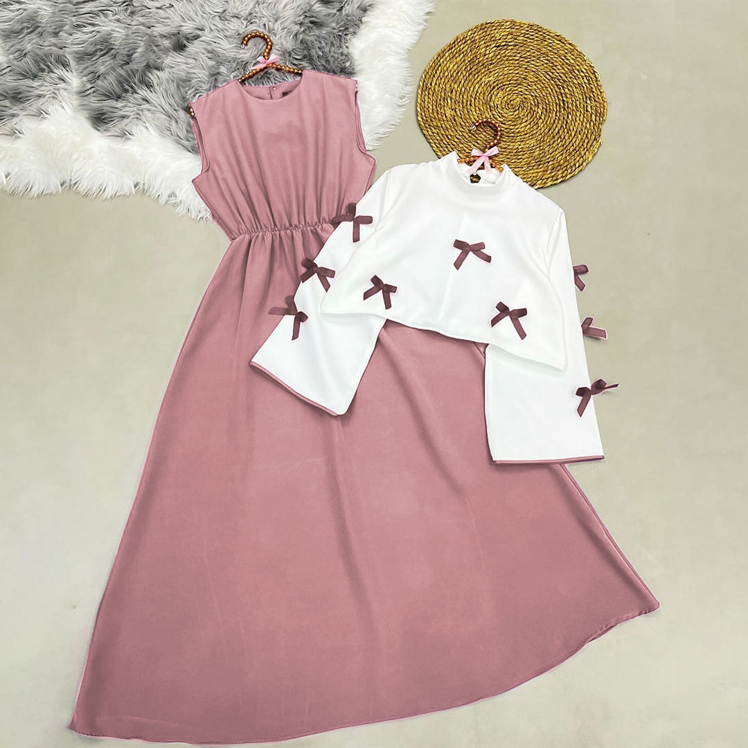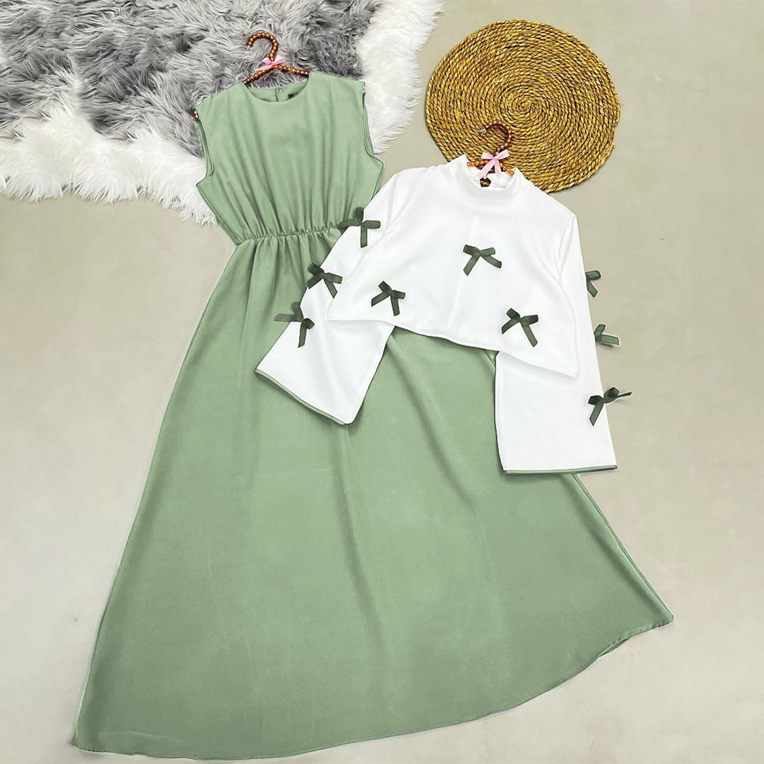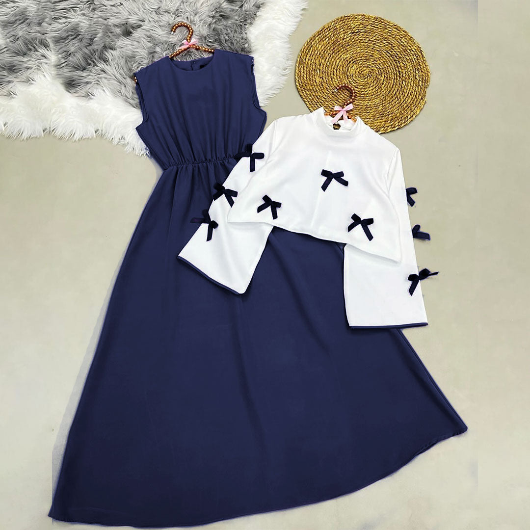 This sophisticated maxi dress features a timeless silhouette with a softly cinched waist that flatters the figure beautifully. Paired with a stylish white cropped shrug, adorned with delicate bow details, this two-piece set creates a refined and elegant look.